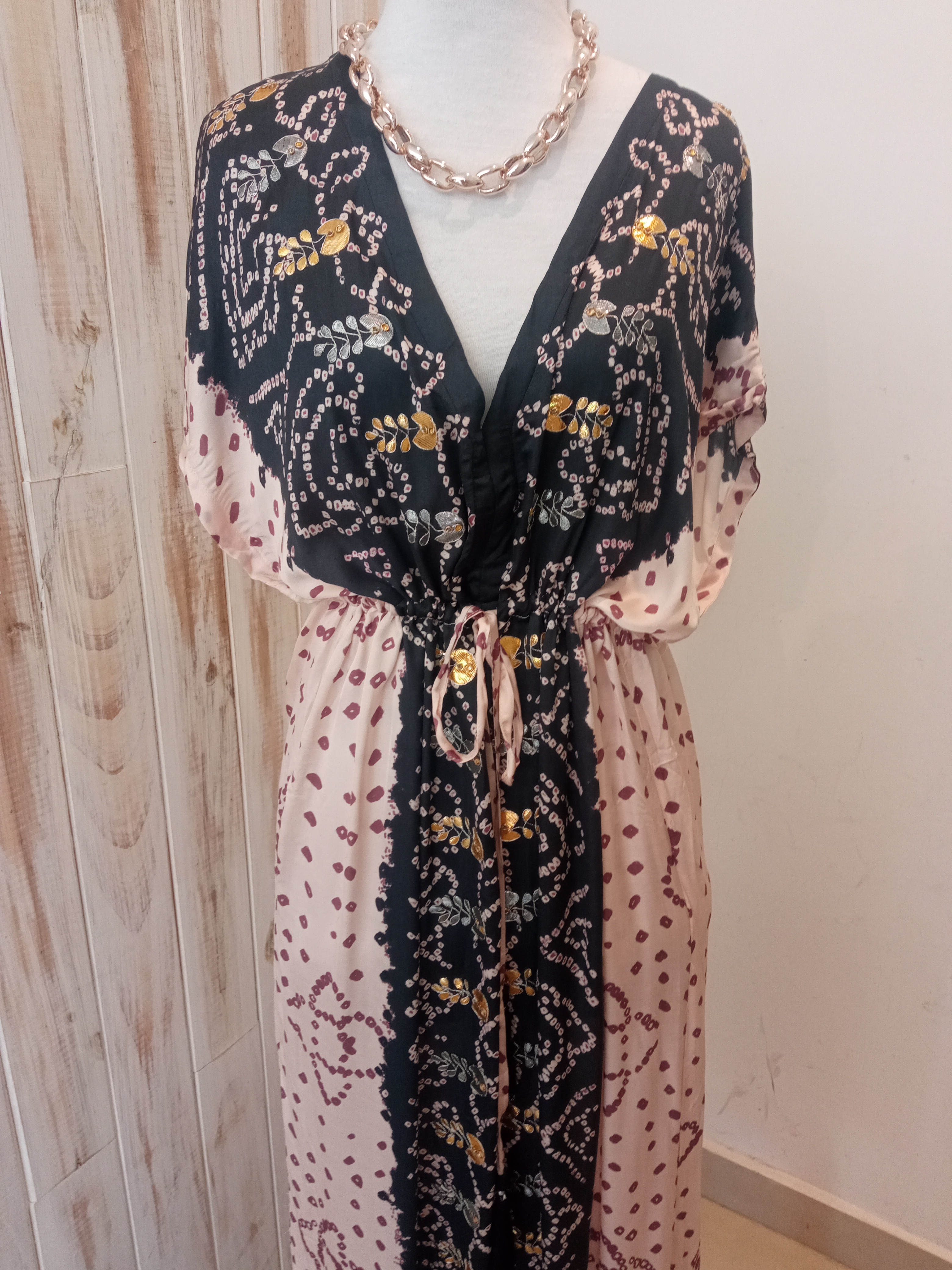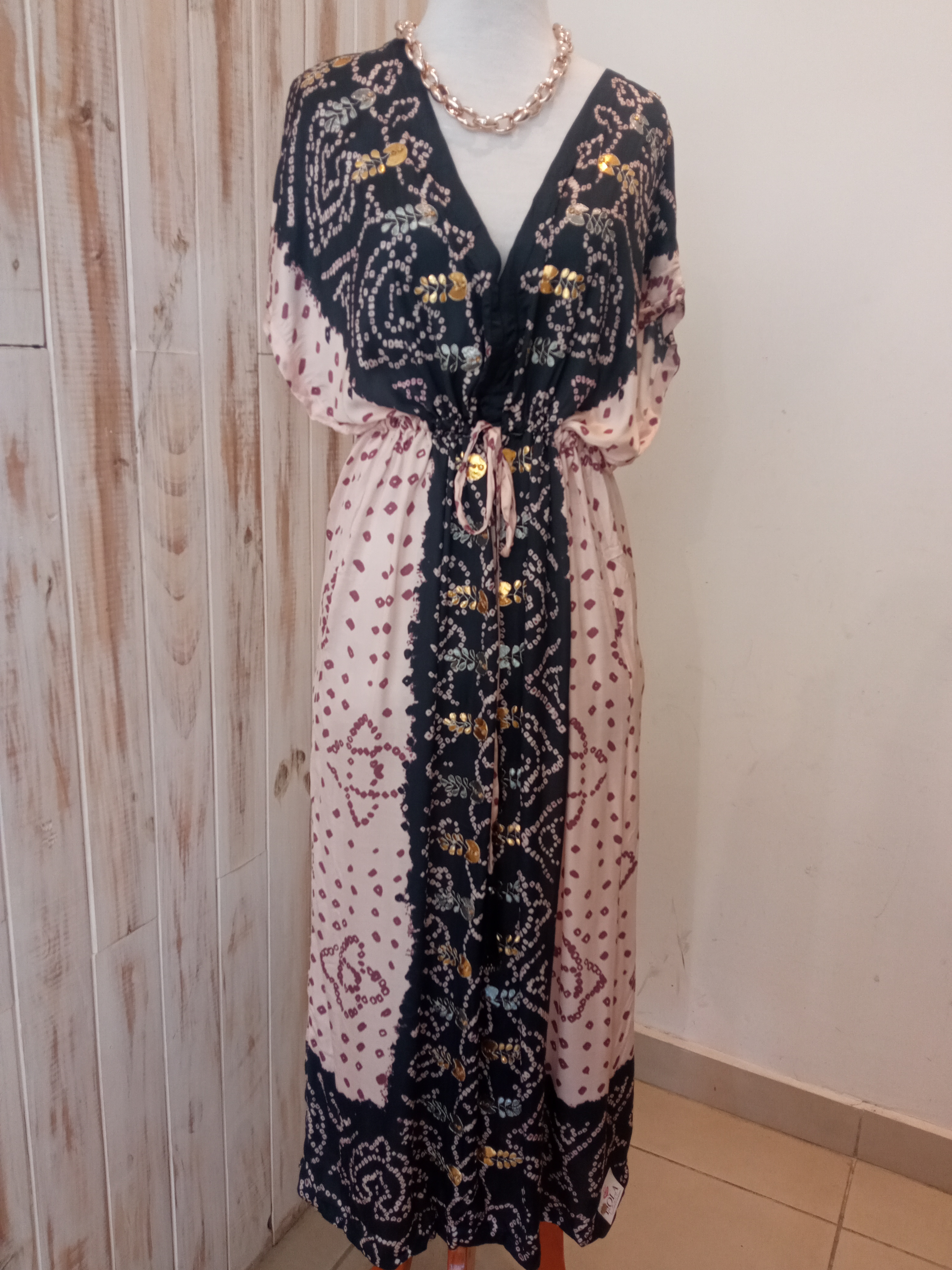 TUNICA MARCA RAPSODIA EN COLOR BEIGE Y AZUL PETROLEO CON DETALLES DORADOS AJUSTABLE EN CINTURA